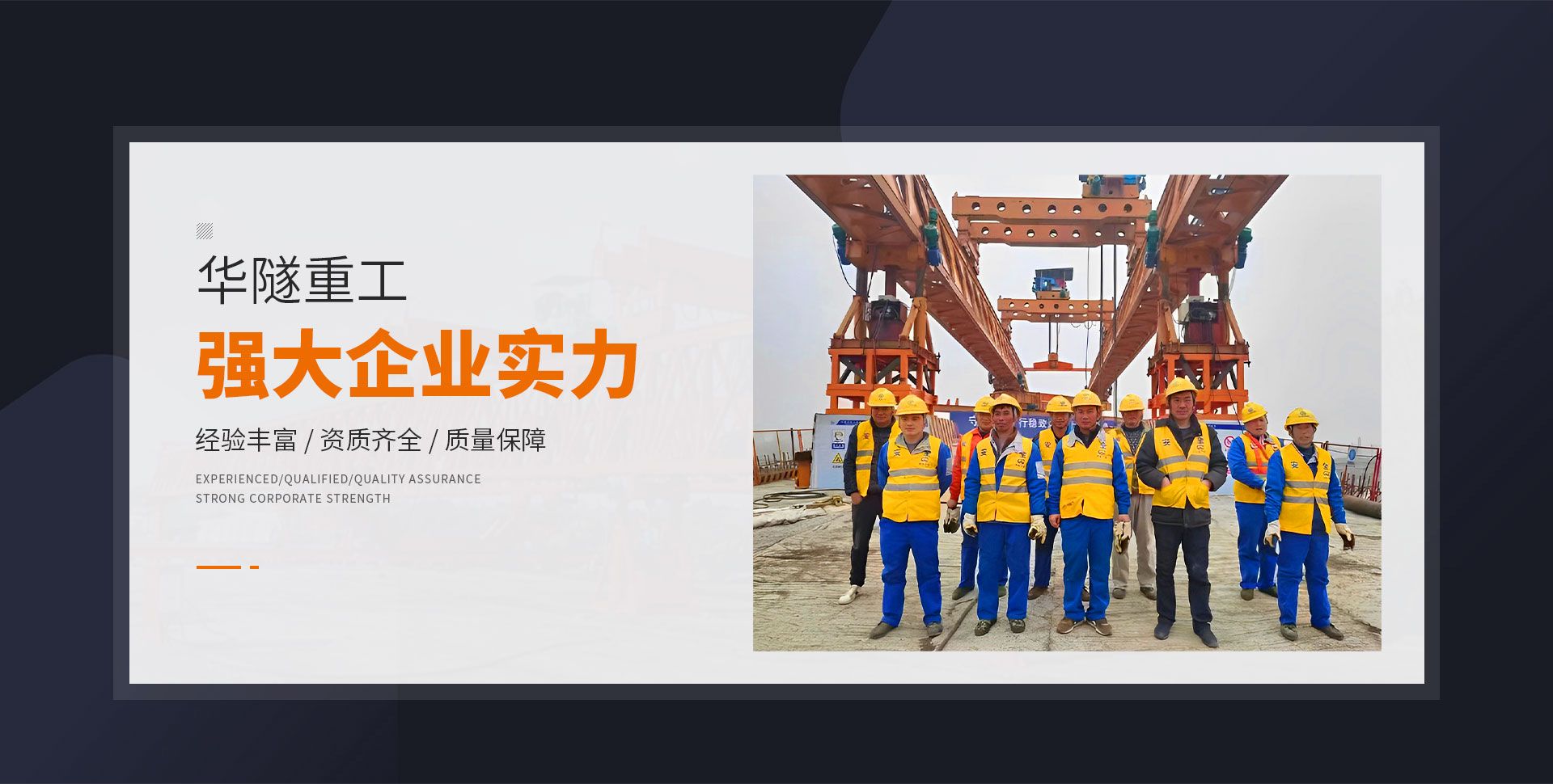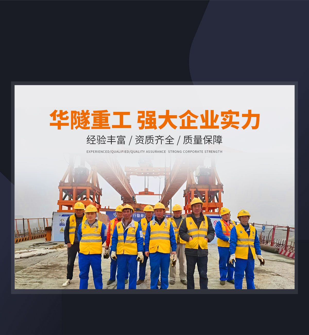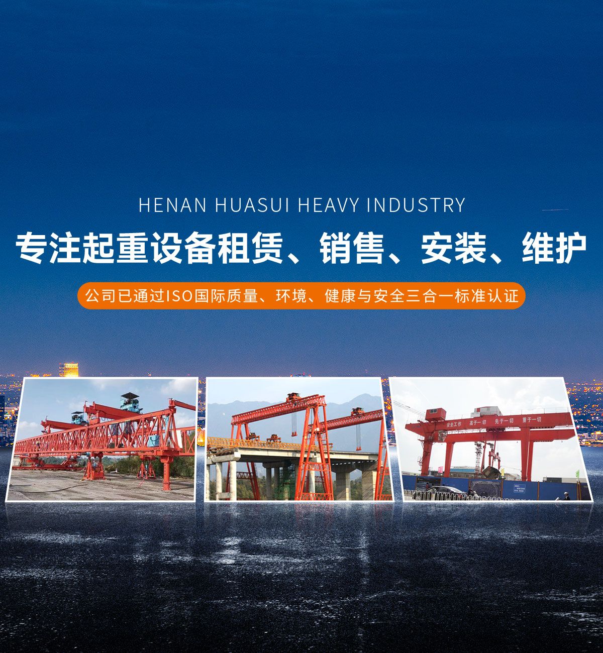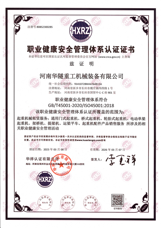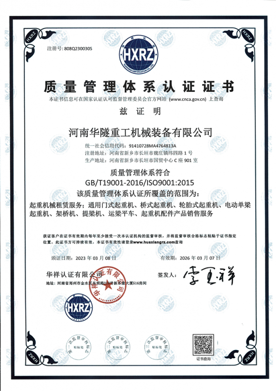 河南華隧重工機械裝備有限公司主要從事通用門式起重機、橋式起重機、電動單梁起重機,輪胎式起重機、架橋機、提梁機、遠梁平車、鋼絲繩電動萌蘆、卷揚機、起重配件制造、銷售:起重機械租賃、安裝和維修,起重設(shè)備園收,機械設(shè)備維修,鋼結(jié)構(gòu)工程承包,橋梁工程及技術(shù)咨淘服務(wù),銷售五金制品、機電設(shè)備:建設(shè)工程監(jiān)理,建設(shè)工程設(shè)計,各類工程建設(shè)活動,建筑勞務(wù)分包,建筑物折除作業(yè),施工作業(yè),工程管理服務(wù),土石方工程施工,裝如發(fā)運?! 」疽淹ㄟ^IS0國際質(zhì)量、環(huán)境、健康與安全三合一標準認證,特種設(shè)備制造許可證和特種設(shè)備安裝改造維修許可證。擁有完熟的質(zhì)量管理體系。嚴格的管理制度,強大的生產(chǎn)能力和先進的檢測手段,在保證產(chǎn)品質(zhì)量的同時,也具備了極強的市場競爭力?! 」緢猿挚萍紕?chuàng)新為理念,產(chǎn)品質(zhì)量為核心,注重信譽,建立了減信可靠、快捷、思速。便利周到的售后服務(wù)網(wǎng)絡(luò)。  我們擁有的技術(shù)專家和技術(shù)服務(wù)隊伍為客戶提供充善的售前技術(shù)支持和全天候的售后服務(wù)體系,讓您無后顧之憂,享受一站式的超值服務(wù)?!  叭A隧重工,伴您成功“是華隧重工永遠的宗指,真被的希望與各界朋友攜手并進。共創(chuàng)輝準!